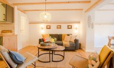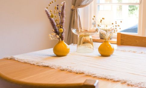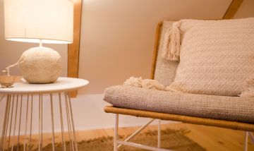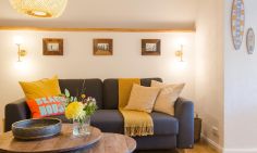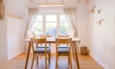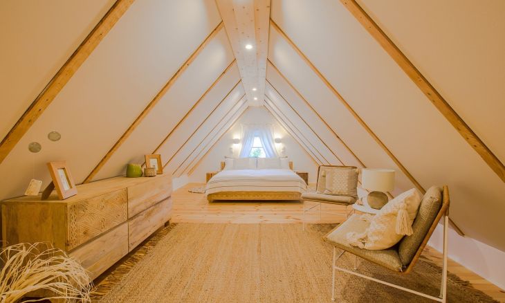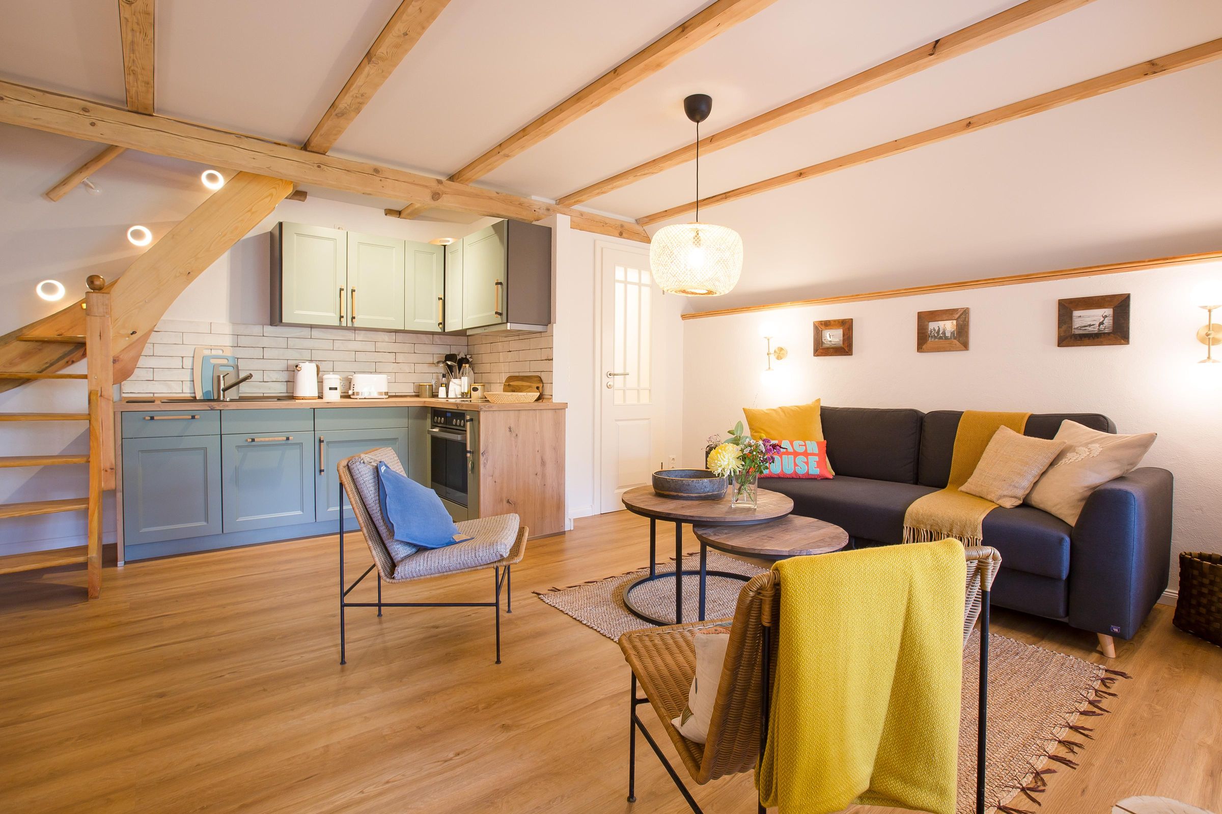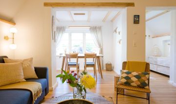 Es ist genau diese Liebe und Leichtigkeit, die du in dem naturverbundenen Ambiente von Aloha Hale spüren und genießen kannst. Das traumhafte Ferienhaus begeistert mit einem offenen Wohnkonzept und ganz viel Liebe zum Detail. Der Wohn- und Essbereich, die voll ausgestattete Küche und das Badezimmer befinden sich im Erdgeschoss und fließen harmonisch ineinander. Naturmaterialien wie Holz und Rattan bestimmen dabei die Einrichtung ganz wesentlich und sorgen für Wärme und Behaglichkeit in den stylischen Räumen. Über eine Treppe gelangst du in das Schlafzimmer im Obergeschoss. Darin befindet sich eine Schlafnische mit einem Doppelbett (140 cm) sowie ein großer Raum mit einem weiteren Doppelbett (160 cm), Schrägen, sichtbaren Balken und einer Sitzecke. Beide Schlafgelegenheiten sind offen und dank des Boho-Wohnstils modern, gemütlich und ungezwungen gestaltet.