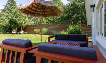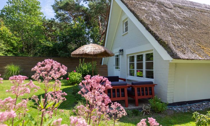 Zum Ferienhaus gehört eine Terrasse mit Lounge-Möbeln und ein großer gemütlicher Garten mit extra Gartenmöbeln inklusive Sonnenschirm. Besonderes Highlight ist das separate Saunahäuschen, was dem besonderen Stil des Ferienhauses ebenfalls gerecht wird. Die Sauna kann gegen Gebühr (4x2€) genutzt werden. Ein Pkw-Stellplatz befindet sich auf dem Grundstück.