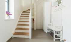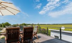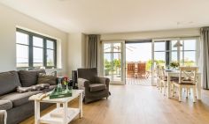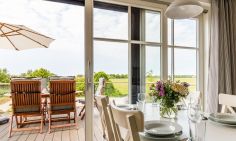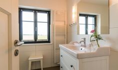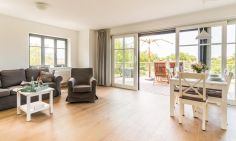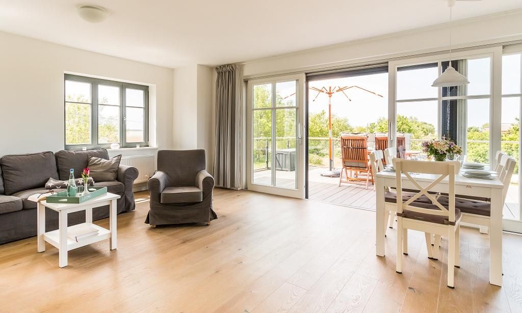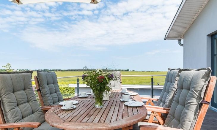 Im Obergeschoss mit separatem Eingang erwartet dich der moderne Wohnbereich mit einer gemütlichen Sitzecke am Kaminofen. Die offene Küche und der Essbereich am Panoramafenster fügen sich harmonisch ein. Ein Schlafzimmer mit einem Doppelbett und zusätzlichem Einzelbett sowie ein zweites Schlafzimmer mit zwei Einzelbetten laden zum Ausruhen ein. Das Bad mit Dusche/WC rundet die Wohnung ab. Auf der großen Dachterrasse genießt du einen traumhaften Blick zum Bodden und über die Felder. Hier fängt dein Urlaub an. Es handelt sich um eine Nichtraucher-Wohnung, Haustiere sind nicht gestattet.