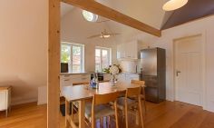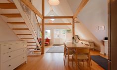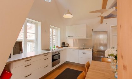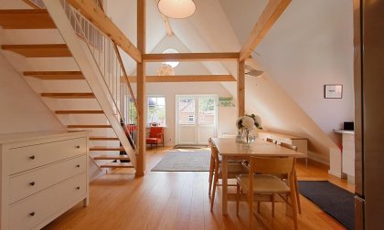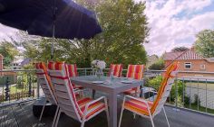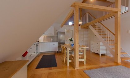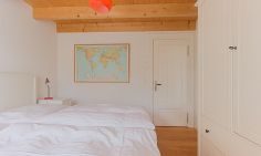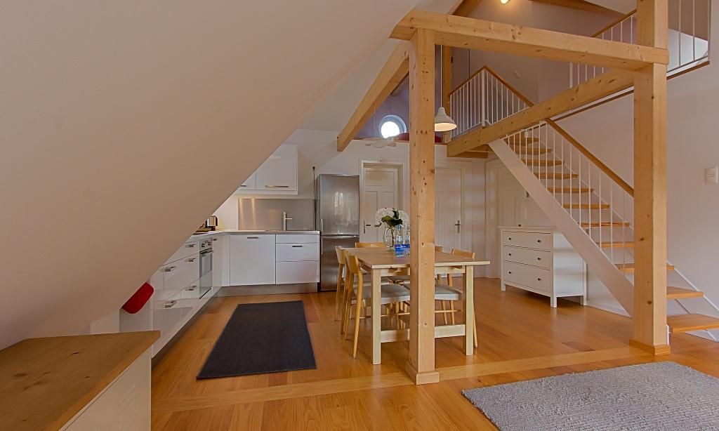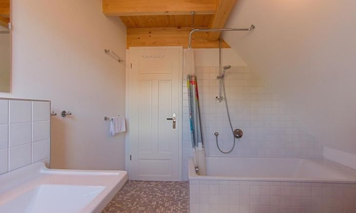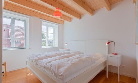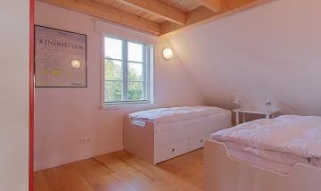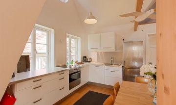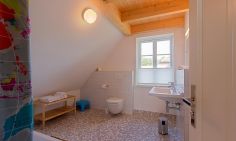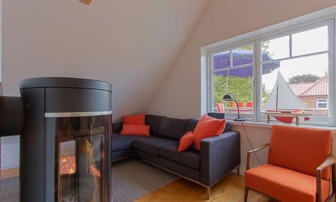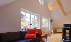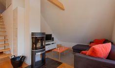 Die große Dachterrasse ist zeitgleich auch der Eingang zur Wohnung. In der Obergeschosswohnung erwartet dich der lichtdurchflutete Wohnbereich mit gemütlicher Sitzecke am Kaminofen sowie die offene Küche mit angrenzendem Essbereich. Weiterhin gibt es zwei Schlafzimmer, eines ist mit einem Doppelbett, das andere mit zwei Einzelbetten ausgestattet. Das angrenzende Bad verfügt über eine Badewanne mit Duschvorrichtung und WC. Das Dachgeschoss beherbergt eine offene Schlafgalerie mit einem weiteren Doppelbett und kann als zusätzliche Aufbettung für ein bis zwei Personen genutzt werden. Die gesamte Wohnung ist mit hochwertigen Holzmöbeln ausgestattet, die perfekt mit den hellen, freundlichen Räumen harmonieren und ein tolles Wohnambiente schaffen.