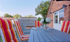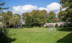 Der großzügige und liebevoll gestaltete Garten mit Sitzbank unterm Baum kann von allen drei Einheiten des Ferienhauses genutzt werden. Ebenso steht der Gemeinschaft eine Tischtennisplatte, ein Basketballkorb, Fußballtore und ein Bollerwagen zur Verfügung.