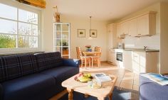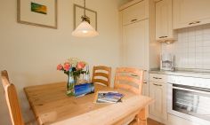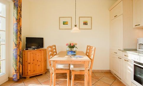 Die helle und freundliche Erdgeschosswohnung empfängt dich im Wohnraum mit einer gemütlichen Sitzecke im Erker. Die Küchenzeile fügt sich direkt ein und schafft einen offenen Wohncharakter. Auch das Schlafzimmer ist gemütlich und mit einem Doppelbett ausgestattet. Das separate Bad verfügt über Dusche/WC. Eine zusätzliche Aufbettungsmöglichkeit für ein bis zwei Personen bietet die Couch im Wohnbereich.