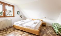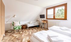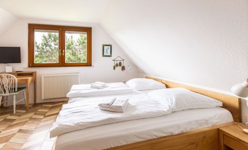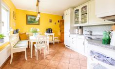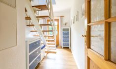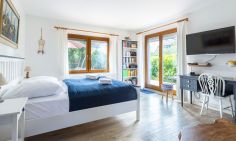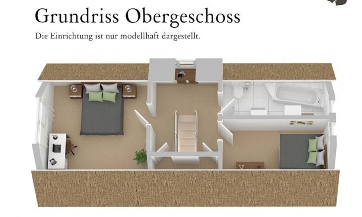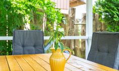 Im Erdgeschoss erwartet dich ein kleiner Eingangsbereich, ein Schlafzimmer mit Doppelbett (160 cm) und Austritt zu einer der zwei Terrassen, ein Bad mit Dusche/WC sowie die separate Landhaus-Küche. Der massiv gebaute Wintergarten wurde als Wohnbereich mit gemütlicher Sitzecke und viel Liebe zum Detail eingerichtet. Von hieraus gelangst du in die angeschlossene Küche sowie in den Garten. Das Obergeschoss beherbergt ein Schlafzimmer mit einem großen Doppelbett und einem separaten Kinderbett in West-Ausrichtung, ein weiteres Schlafzimmer mit einem Doppelbett sowie ein Bad mit Badewanne/WC.