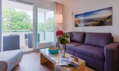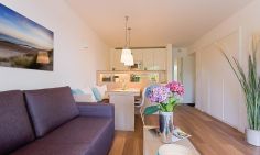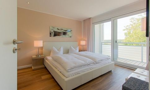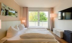 Die moderne Wohnung verfügt über einen kombinierten Wohn- und Essbereich sowie ein Schlafzimmer mit direktem Zugang zum exklusiven Bad/WC, das mit einer Zwei-Quadratmeter großen ebenerdigen Regendusche ausgestattet ist. Durch die mattierte Glastür hast du auch im Bad Tageslichteinfall. Das Schlafzimmer verfügt neben dem Doppelbett über ein sehr großzügiges Kleiderschranksystem, das sich über die gesamte Länge des Raumes erstreckt. Dadurch bietet sich viel Stauraum, auch für deine Koffer. Die Ausrichtung der Wohnung besticht durch ihre Südlage und bietet dir einen 12 m² großen Südbalkon mit weitläufigem Wiesenblick. Für absoluten Wohnkomfort steht dir sowohl im Wohn- als auch im Schlafbereich ein TV zur Verfügung, so dass gemütliches Fernsehen auch vom Bett aus möglich ist. Die voll ausgestattete Küche mit Tresen lässt keine Wünsche offen. Bei der Ausstattung wurde viel Wert auf hochwertiges Interieur gesetzt. Die Wohnung kann durch die elektrischen Rollläden komplett verschattet werden.