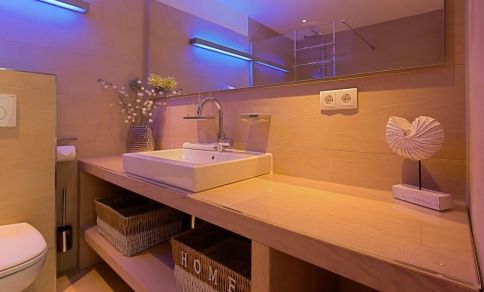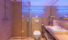 Das große Badezimmer mit der blauen Beleuchtung unterstreicht die