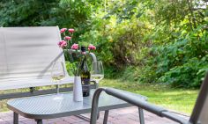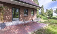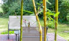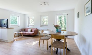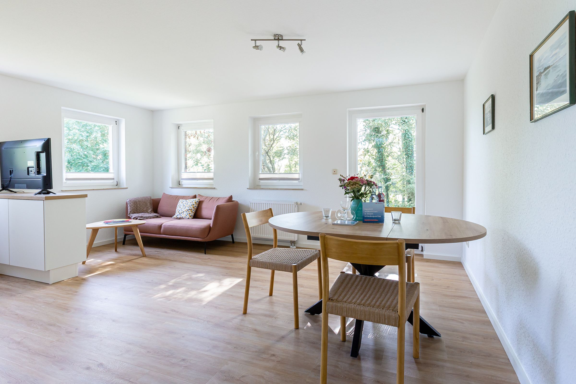 Die Sonne schickt ihre Strahlen großzügig durch die Fenster, während die Terrasse zum Frühstück im Freien lockt oder zum Füße hochlegen nach einem langen Spaziergang an der Steilküste. Zur Ferienwohnung gehören außerdem zwei Fahrradstellplätze und ein Pkw-Stellplatz.