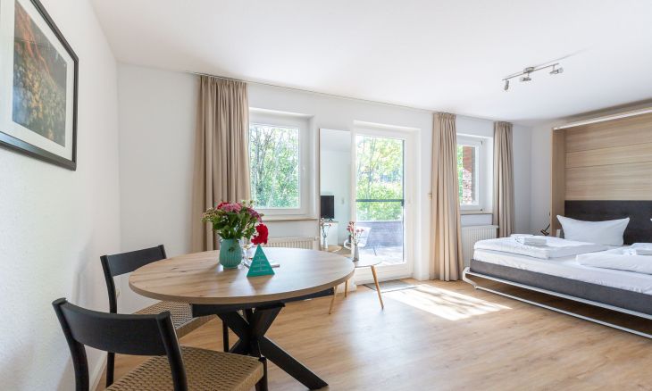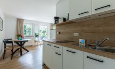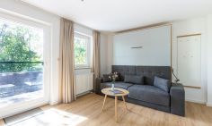 Auf 31 gut genutzten Quadratmetern bietet dieses charmante Einraum-Apartment alles, was du für eine entspannte Auszeit an der Ostsee brauchst. Mit seiner cleveren Raumaufteilung punktet die Wohnung vor allem bei Gästen, die es praktisch, hell und unkompliziert mögen. Das klappbare Bett verschwindet tagsüber ganz einfach in der Wand und macht Platz für ein kleines Sofa, auf dem man gemütlich lesen, einen Film schauen oder einfach die Ruhe genießen kann. Die Küchenzeile ist funktional und schick – perfekt für den schnellen Kaffee am Morgen oder das Abendessen nach einem Strandtag.