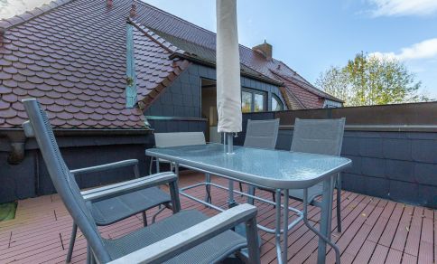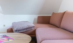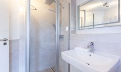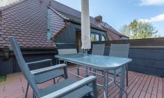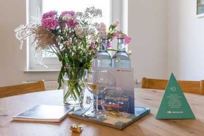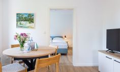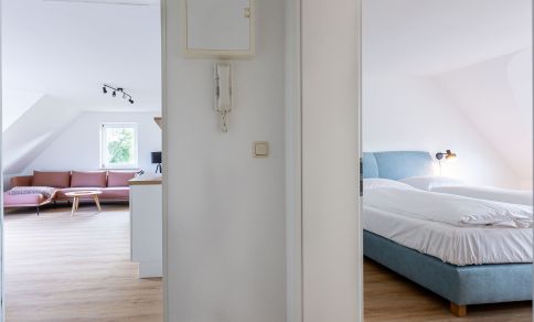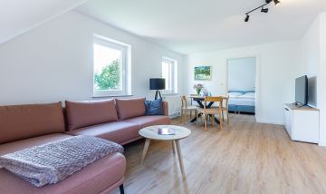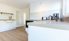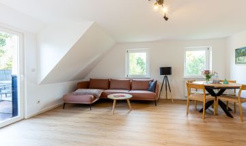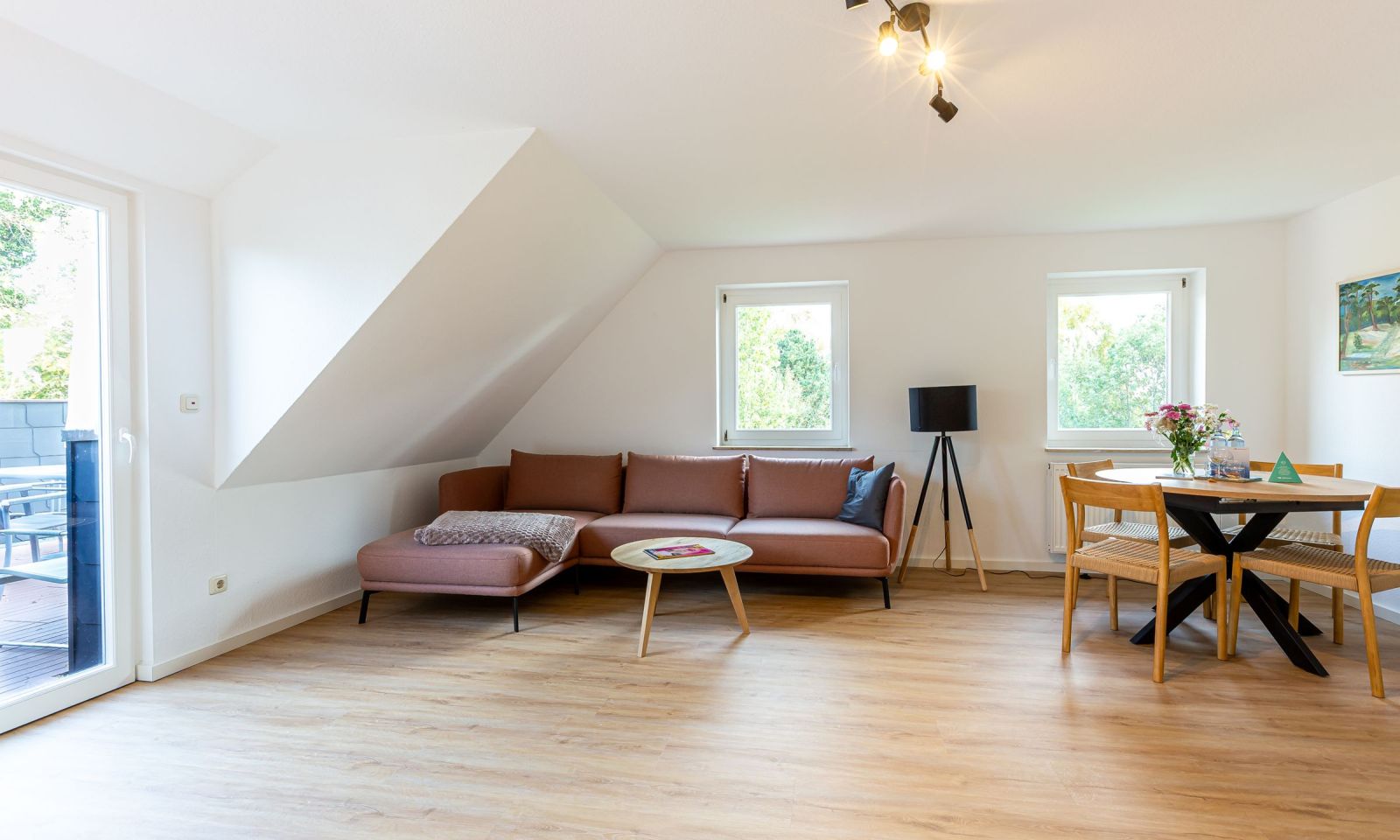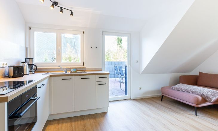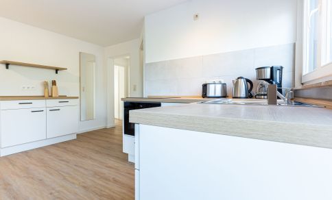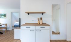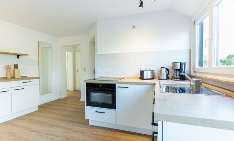Die neu sanierte Ferienwohnung befindet sich im ersten Stock des Mehrfamilienhauses. Der helle Wohn- und Küchenbereich bildet das Herzstück der Wohnung. Die moderne Küche ist vollständig ausgestattet und lässt keine Wünsche offen – ob für ein gemeinsames Frühstück auf dem Balkon oder ein gemütliches Abendessen nach einem Strandtag. Hochwertige Möbel sorgen dabei für ein elegantes und harmonisches Wohngefühl.