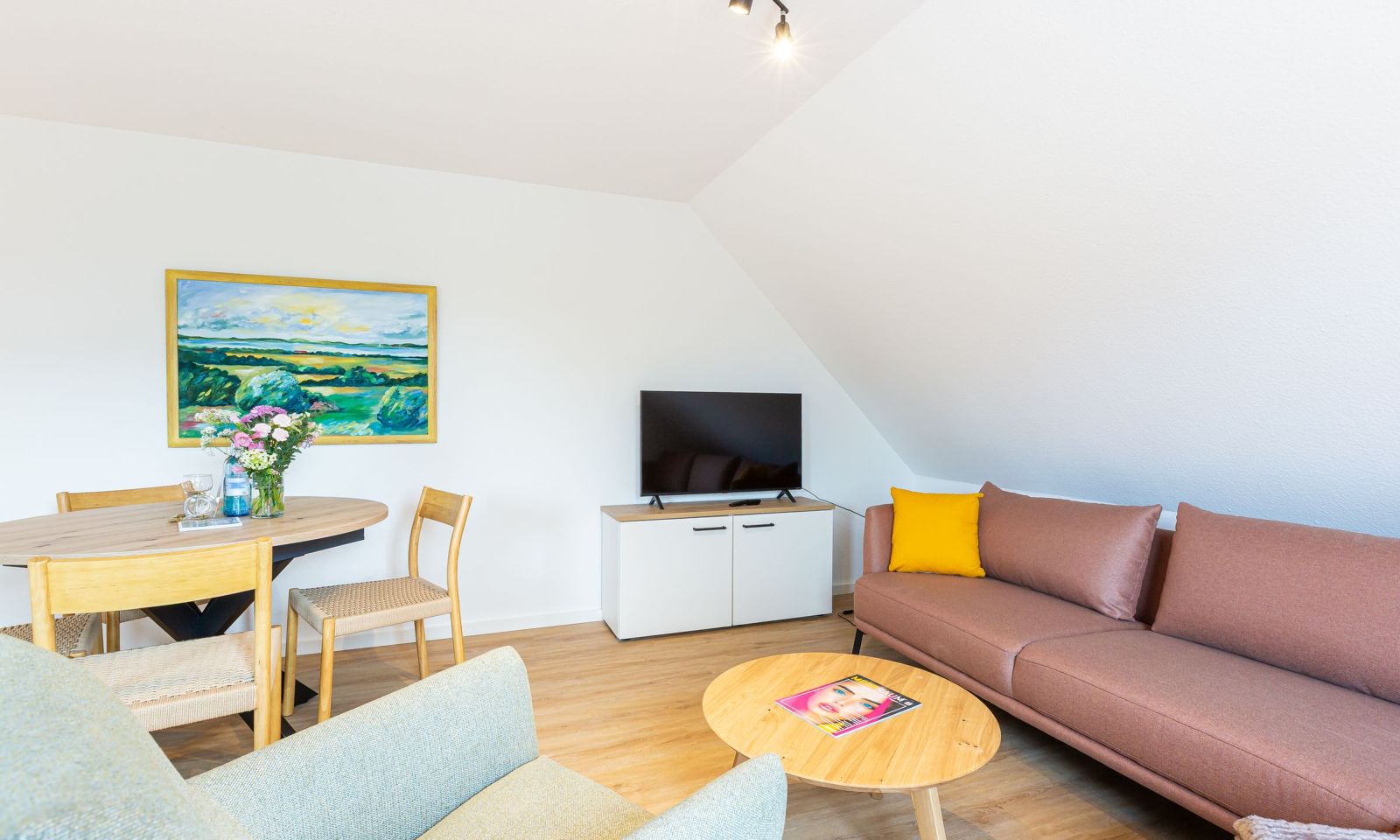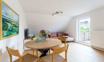 Willkommen in deiner neuen Ferienwohnung, mitten im idyllischen Ahrenshoop. Diese helle und komfortable 3-Zimmer-Wohnung im ersten Stock bietet dir alles, was du für eine entspannte Auszeit an der Ostsee brauchst. Der offene Wohn- und Küchenbereich ist modern und hochwertig möbliert – hier kannst du gemeinsam mit deinen Liebsten kochen, essen und gemütliche Stunden verbringen. Zwei einladende Schlafzimmer sorgen für erholsamen Schlaf nach einem Tag voller Erlebnisse an der frischen Luft. Das Badezimmer ist funktional gestaltet und rundet das Wohlfühlangebot ab.