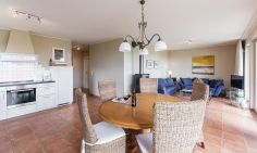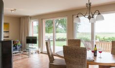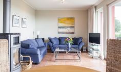 Die Erdgeschosswohnung begeistert mit ihrem lichtdurchfluteten Wohnraum und einem traumhaften Ausblick. Gemeinsam mit der gemütlichen Sitzecke am Kaminofen und TV, dem großzügigem Essbereich und der modernen Küchenzeile ergibt sich ein Wohnambiente zum Wohlfühlen und Erholen. Die Schlafzimmer sind harmonisch und geräumig gestaltet. Das Hauptschlafzimmer ist mit einem Doppelbett, das weitere mit zwei Einzelbetten ausgestattet. Das moderne Bad beinhaltet eine Badewanne mit Duschvorrichtung und ein WC.
