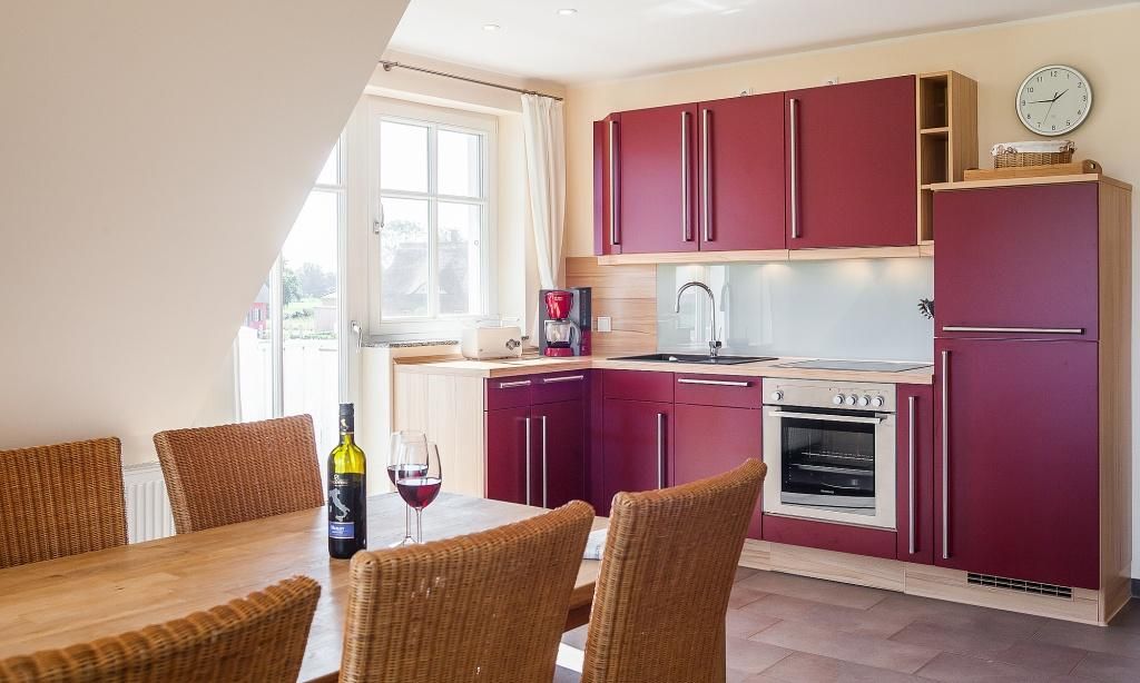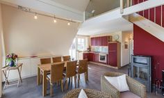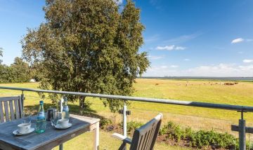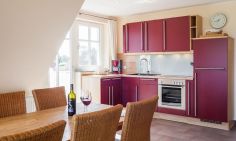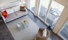 Die Wohnung im Obergeschoss erstreckt sich als Maisonette-Wohnung über zwei Etagen. Der großzügige Wohnraum mit hochwertiger Einrichtung bietet dir eine gemütliche Sitzecke am Kaminofen und den Austritt zum sonnigen Südbalkon mit einem traumhaften Panoramablick auf den Bodden. Der Essbereich mit komfortabler Küchenzeile fügt sich harmonisch in den Wohnbereich ein und besticht durch seine klaren Linien. Von der Küche hast du Zutritt zu einem zweiten kleinen Balkon. Ein modernes Bad mit Dusche/WC und die beiden Schlafzimmer befinden sich ebenfalls auf der ersten Etage. Das Hauptschlafzimmer ist mit einem Doppelbett und das weitere mit zwei Einzelbetten ausgestattet. Vom Wohnbereich gelangst du auf die zweite Etage. Hier erwartet dich eine kleine Wellnessoase mit Sauna, Gäste-WC und Ruhebereich. Du genießt auch hier einen fantastischen Blick auf den Bodstedter Bodden. Ein erholsamer Urlaub ist dir garantiert!