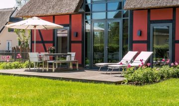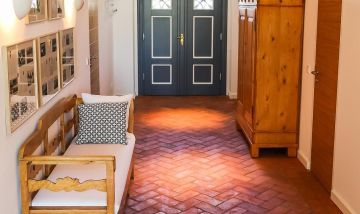 Das heutige Haus ist auf dem Grundriss eines historischen Hallenhauses aus den 1790-iger Jahren erbaut. Den Eigentümern war es wichtig, die Charakteristiken des ehemaligen Bauernhauses zu bewahren - und das nicht nur im äußeren Erscheinungsbild mit Fachwerk, Sprossenfenstern, Klappläden und traditionellen Darßer Haustüren. Auch im Inneren finden sich Zitate, die an das ehemalige Haus erinnern: die große Eingangshalle mit Blick bis in den Garten, die Böden aus handgeformtem Cotto oder auch antike Möbel. Auf modernen Komfort musst du natürlich nicht verzichten: Bodengleiche Duschen, eine exklusive Einbauküche, ein großer Kamin sowie Fußbodenheizung gehören ebenso zur Ausstattung. Die Erdgeschosswohnung verfügt über großzügige 120 Quadratmeter. Tritt ein in den großzügigen Wohnbereich mit einer gemütlichen Sitzecke am Kamin und einem einladenden Essbereich. Die Einbauküche ist sehr exklusiv und komplett ausgestattet. Es erwartet dich außerdem ein Schlafzimmer mit einem Doppelbett (180 cm) und einem Bad en Suite mit einem Doppelwaschtisch und Dusche/WC sowie ein weiteres Schlafzimmer mit Doppelbett (180 cm) und ein separates Bad mit Dusche/WC.