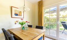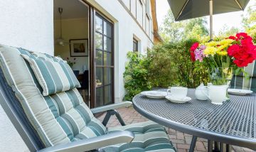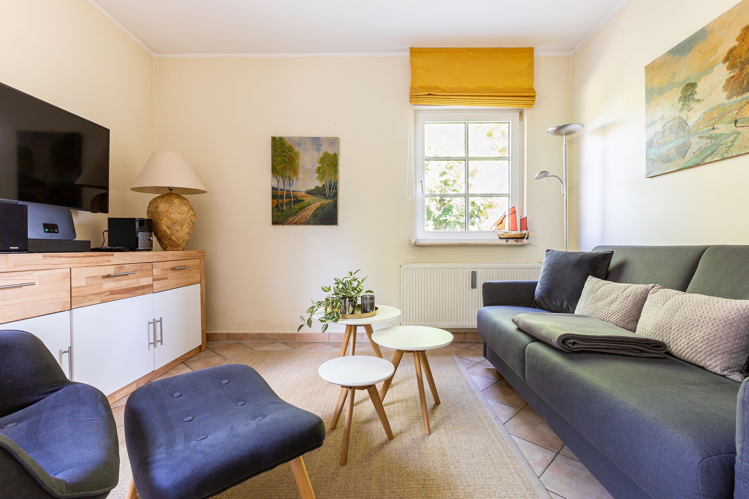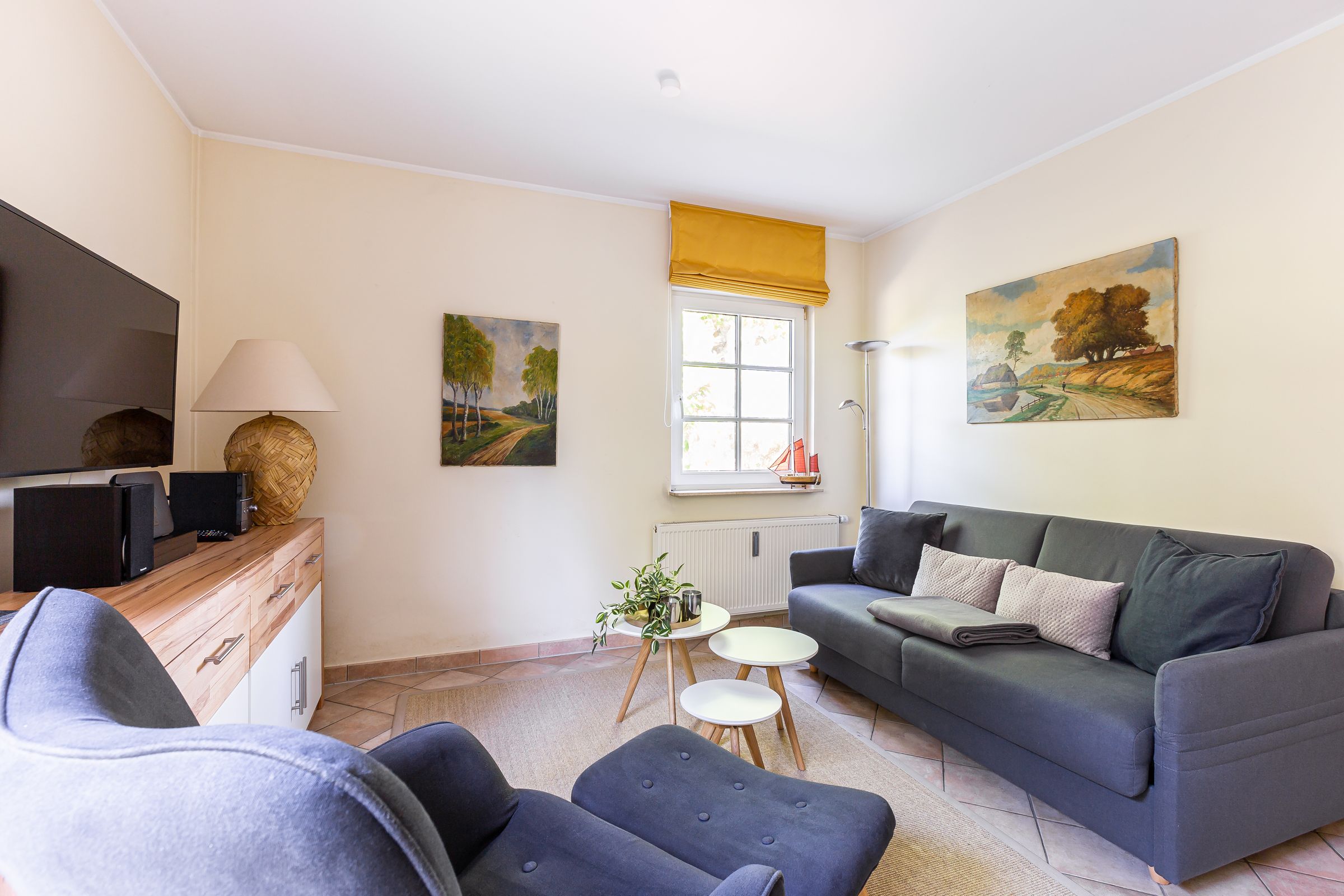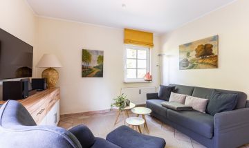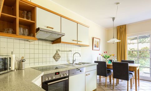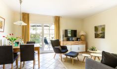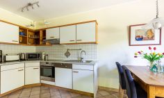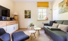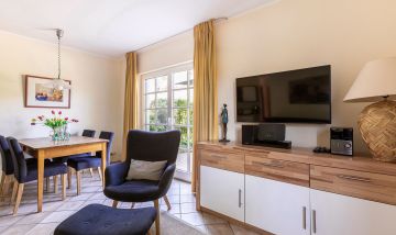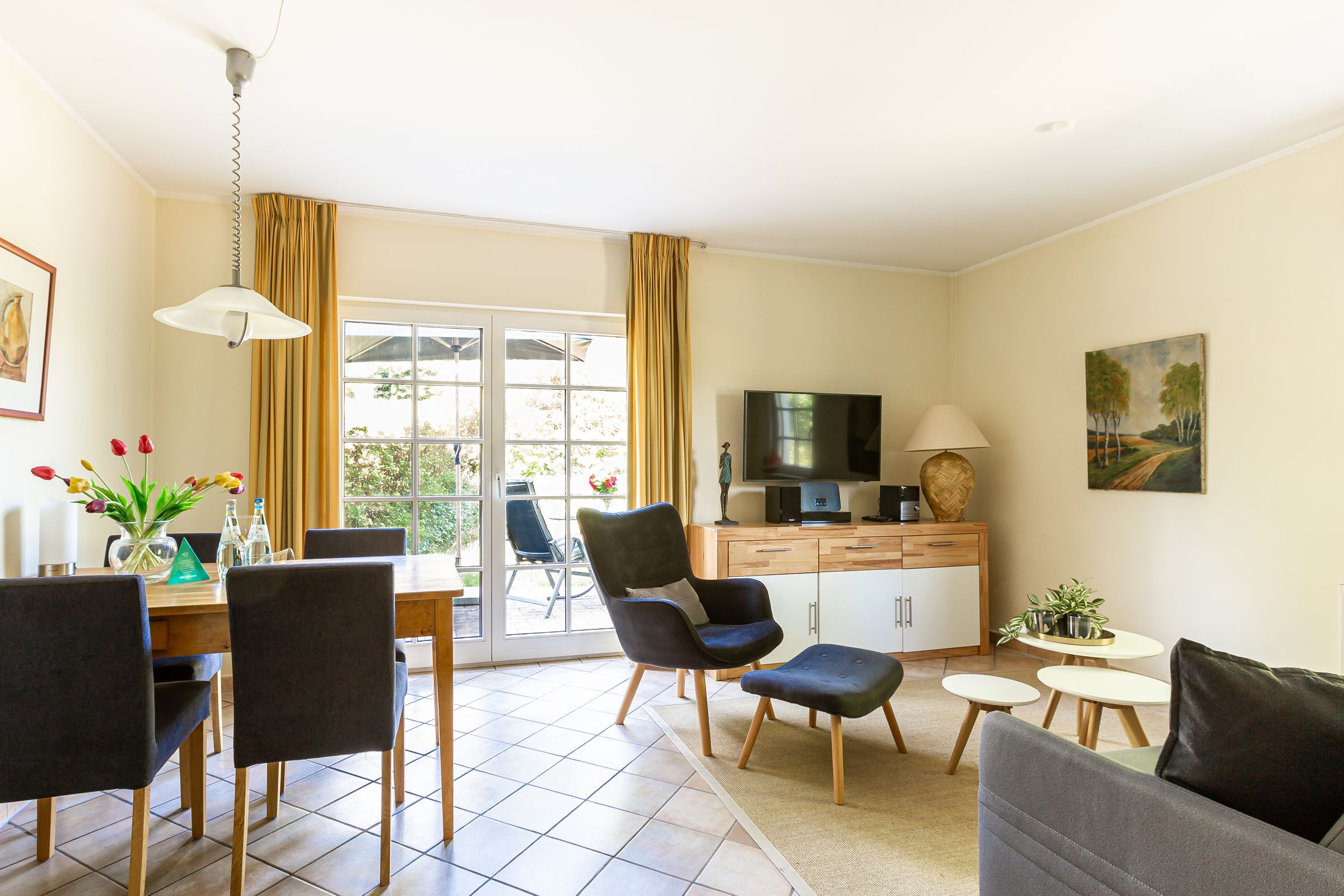 Die Erdgeschosswohnung ist gemütlich ausgestattet und bietet alles was es für einen erholsamen Urlaub zu zweit braucht. Der Wohnbereich verfügt über eine Couch und Sessel zum Relaxen. Offen gestaltet, befindet sich auch die Küchenzeile mit Esstisch mit im Raum. Top ausgestattet mit Geschirrspüler und Miele-Geräten lässt es sich hier komfortabel kochen. Auch das Schlafzimmer ist auf Erholung ausgelegt. Mit den Biomatratzen und großzügigem Doppelbett, Echtholzparkett und Verdunklungsvorhängen bekommt man hier den friedlichen Schlaf, den man sich im Urlaub wünscht. Abgerundet wird die 46 qm Wohnung mit einem Ankleidezimmer mit großem Kleiderschrank und einem Tageslichtbad mit Dusche und WC.