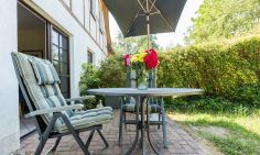 Der Außenbereich verfügt über eine Terrasse mit Südwestausrichtung, Outdoor-Möbeln, Sonnenliegen und Sonnenschirm. Hier lassen sich die Urlaubstage am Morgen beim Frühstück starten und am Abend bei einem Glas Wein und einem guten Buch ausklingen. So liest sich Urlaub? Finden wir auch. Zur Ferienwohnung gehört ein PKW-Stellplatz (gekennzeichnet mit dem Buchstaben "Q").
