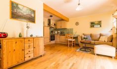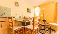 Die gemütliche Erdgeschosswohnung eignet sich perfekt für einen Urlaub zu zweit. Der offen gestaltete Wohnraum unterteilt sich in den TV-Bereich mit gemütlicher Couch zum Relaxen und der Küchenzeile mit integriertem Esstisch. Das heimelige Schlafzimmer mit Doppelbett und ein Badezimmer mit Dusche/WC komplementieren die liebevoll gestaltete Ferienwohnung.