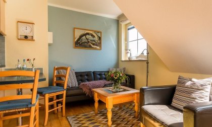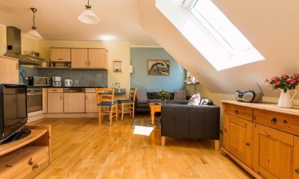Über eine separate Außentreppe gelangst du in die Ferienwohnung. Die gemütliche Unterkunft besitzt einen offenen Wohnbereich mit kleiner Sitzecke und TV-Bereich sowie eine Küchenzeile mit integriertem Esstisch. Das Schlafzimmer ist hell und freundlich gestaltet und verfügt über ein Doppelbett sowie genügend Stauraum in den Schränken. Ein Badezimmer mit Dusche/WC und Handtuchheizer runden die niedliche Ferienwohnung ab. Hier findest du alles vor, was du für einen Urlaub zu zweit brauchst.