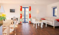 Pro: - Die Lage ist hervorragend und das wichtigste Kriterium überhaupt. - Die Terrasse und der Grundriss des Gebäudes sind ideal, besonders wenn man wie wir mit Freunden im Urlaub ist und sie die andere Wohnung nutzen. - Ruhige und sichere Umgebung für Kinder. - Die Ausstattung ist umfassend und lässt keine Wünsche offen. - Die Wohnung entsprach genau den Bildern und war modern sowie zeitgemäß eingerichtet. Neutral: - Erst nach zweimaligem Nachfragen haben wir eine neue, funktionierende Babymatratze erhalten. - Für uns waren die Matratzen der Betten ungeeignet und führten zu schlaflosen Nächten. Negativ: - Das Hauptbad im "Kleinen L" Nr. 1 benötigt eine Renovierung. Zwar ist das Bad grundsätzlich modern, jedoch sind die Fugen auf dem Boden teilweise ausgebrochen und in der Dusche gibt es Schimmel im Silikon. Der Waschtischunterschrank war teilweise schlecht montiert und daher kaum nutzbar. - Ein Marder auf dem Dachboden wurde am Montag gemeldet, aber bis Freitag zur Abreise wurde nichts unternommen, was nachts sehr störend war. Wir würden die Unterkunft unseren Freunden empfehlen!