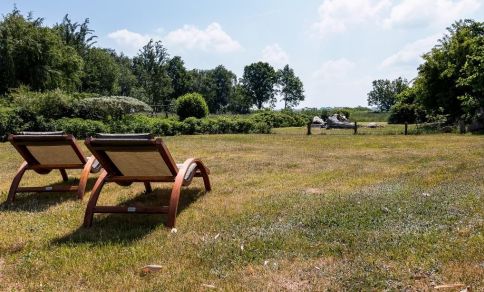 Vom Wohnbereich gelangst du auf die großzügige Holzterrasse. Hier genießt du neben der hochwertigen Bestuhlung mit Sonnenschirm einen traumhaften Blick auf die weite Wiesenlandschaft. Sonnenliegen können ebenso wie der Garten mit genutzt werden. Es steht ein PKW-Stellplatz zur Verfügung.