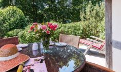 Vom Wohnbereich gelangst du auf die großzügige Holzterrasse. Hier genießt du neben der hochwertigen Bestuhlung mit Sonnenschirm einen traumhaften Blick auf die weite Wiesenlandschaft. Sonnenliegen können ebenso wie der Garten mitgenutzt werden. Ein PKW-Stellplatz steht zur Verfügung.