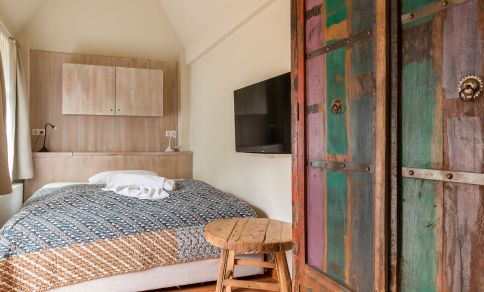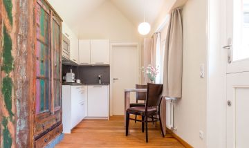 Man könnte auch Tiny House dazu sagen. Beim Lütthus bekommst du alles, was du zum Urlauben auf kleinstem Raum brauchst. Der heimelige kombinierte Wohn-und Schlafraum beherbergt ein Doppelbett, eine Küchenzeile, einen Esstisch mit zwei Stühlen und ein Bad mit Dusche/WC.