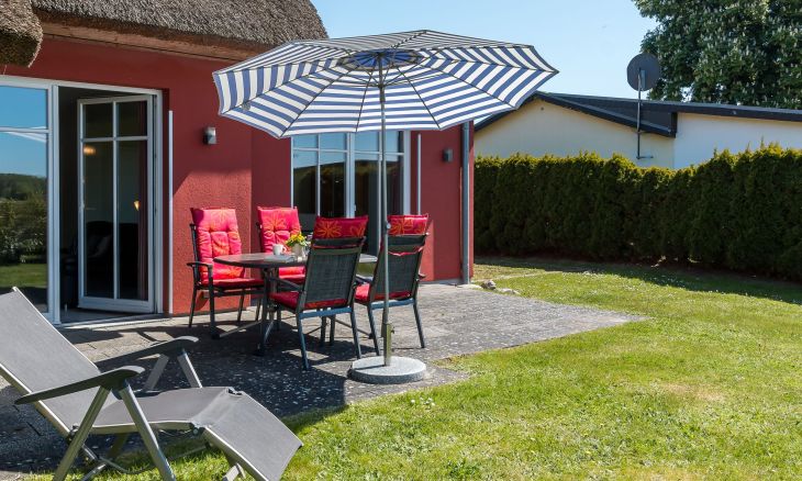Im Außenbereich erwartet dich eine großzügige Steinterrasse mit Sonnenschirm und Bestuhlung. Hier kann der Tag bei einem sonnigen Frühstück starten oder mit einem tollen Sonnenuntergang am Abend enden. Ein PKW-Stellplatz gehört zum Ferienhaus dazu.