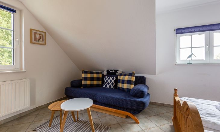 Im Erdgeschoss befindet sich der Wohnraum mit gemütlicher Sitzecke und Kaminofen. Eine kleine Terrasse mit Gartenmöbeln ist am Wohnbereich angeschlossen. Die separate Küche mit einem großzügigen Essbereich, ein Gäste-WC sowie eine weitere Terrasse mit Austritt in den Garten runden das Erdgeschoss ab. Das Dachgeschoss verfügt über zwei Schlafzimmer, die jeweils mit einem Doppelbett ausgestattet sind sowie einem zusätzlichen Bad mit Dusche/WC. Vom Obergeschoss genießt du einen wunderbaren Ausblick auf den Bodden.