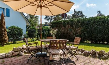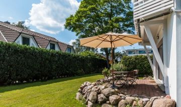 Im Außenbereich steht dir eine Holzdeck-Terrasse mit passender Bestuhlung und Sonnenschirm zur Verfügung. Dank der Heckenbepflanzung ist die Terrasse nicht einsehbar. Hier kannst du deine Ruhe und Privatsphäre genießen - so wie man es sich im Urlaub wünscht. Zudem gehört ein PKW-Stellplatz zur Ferienwohnung dazu.