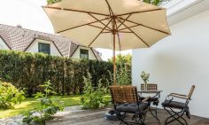 Im Außenbereich steht dir eine Holzdeck-Terrasse mit passender Bestuhlung, Sonnenliegen und Sonnenschirm mit Blick in den Garten zur Verfügung. Dank der Heckenbepflanzung ist die Terrasse von der anderen im EG liegenden Wohnung nicht einsehbar. Hier kannst du deine Ruhe und Privatsphäre genießen - so wie man es sich im Urlaub wünscht.