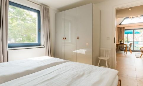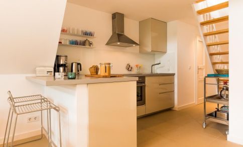 Die Obergeschosswohnung mit separatem Eingang über eine Außentreppe begeistert durch ihren Mix aus schlichter Eleganz und skandinavischem Stil. Ihre Ausstattung ist insgesamt neu, hochwertig und geschmackvoll. Im Wohn- und Essbereich erwartet dich das gemütliche Sofa, ein Kaminofen und bodentiefe Fenster mit Austritt zum Balkon. Die vollständig eingerichtete Küchenzeile ist in den Wohnraum integriert und bietet dir zusammen mit dem Esstisch einen kommunikativen Raum zum Essen, Kochen und Klönen. Natürliche Materialien wie Holz finden sich auch im modernen Schlafzimmer wieder, welches mit einem Doppelbett ausgestattet ist. Ein Badezimmer mit Dusche/WC und Handtuchtrockner macht den Wohnkomfort perfekt.