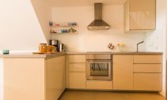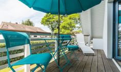 Im Außenbereich steht dir der Südbalkon mit passender Bestuhlung, einer Sonnenliege und Sonnenschirm zur Verfügung. Mit Blick über die Dächer der Nachbarschaft kannst du die Ruhe genießen - wie man es sich im Urlaub wünscht.