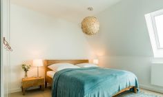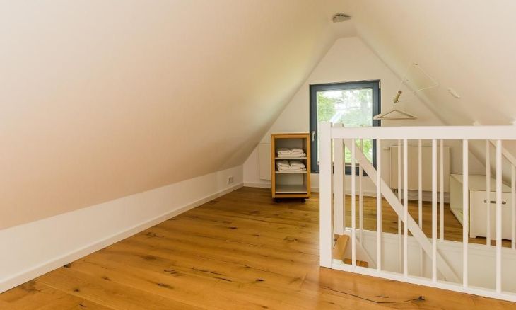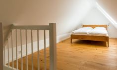 Über eine etwas steilere Treppe erreichst du das zweite offene Schlafzimmer im Dachgeschoss, welches ebenfalls über ein Doppelbett verfügt.