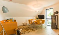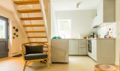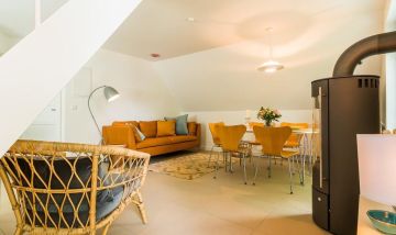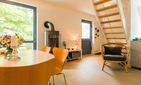 Die Obergeschosswohnung mit separatem Eingang erreichst du über eine Außentreppe. Hier findest du einen Mix aus schlichter Eleganz und skandinavischem Stil. Die Ausstattung der Wohnung ist insgesamt neu, hochwertig und geschmackvoll. Im Wohn- und Essbereich erwartet dich das gemütliche Sofa und ein Kaminofen. Die kleine, aber vollständige eingerichtete Küchenzeile ist in den Wohnraum integriert und bietet dir zusammen mit dem Esstisch einen kommunikativen Raum zum Essen, Kochen und Klönen. Natürliche Materialien wie Holz finden sich auch im modernen Schlafzimmer wieder, welches mit einem Doppelbett ausgestattet ist. Ein Badezimmer mit Dusche/WC und Handtuchtrockner und Fenster macht den Wohnkomfort perfekt.