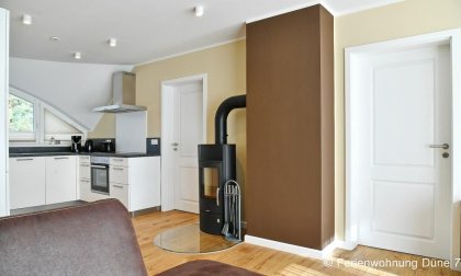 Eine Natursteintreppe führt in die großzügige Maisonette-Wohnung. Im ersten Obergeschoss angekommen, erwartet dich der liebevoll eingerichtete Wohnbereich mit gemütlicher Sitzecke und bodentiefen Fenstern. Der Kaminofen sorgt auch zu jeder Jahreszeit für Urlaubsstimmung. Am Wohnbereich angeschlossen ist die komfortabel ausgestattete Küche. Die etwas versteckte Essecke lädt neben dem gemeinsamen Essen zu Spieleabenden und zum Klönen ein. Ein Schlafzimmer mit einem Doppelbett, ein zweites Schlafzimmer mit zwei Einzelbetten und ein modernes Badezimmer, das mit ebenerdiger Regendusche, WC und zwei Waschbecken begeistert, befinden sich ebenfalls auf dieser Etage. Über eine Eichenholztreppe gelangst du ins Dachgeschoss. Hier ist das dritte Schlafzimmer mit zwei Einzelbetten untergebracht. Abgerundet wird diese moderne Ferienwohnung durch einen acht Quadratmeter großen Balkon, den du vom Wohnbereich betrittst. So macht Urlaub Spaß.