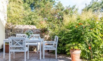 Zur Ferienwohnung gehört eine kleine und windgeschützte Terrasse sowie ein PKW-Stellplatz. Der Garten kann gemeinschaftlich genutzt werden.