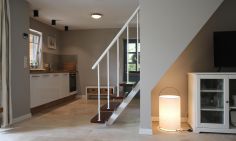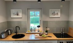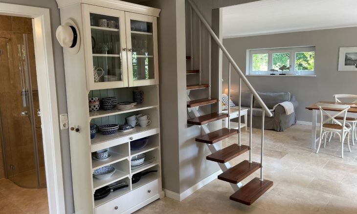 Dieses Ferienhaus strahlt eine herzliche Willkommens-Atmosphäre aus. Freue dich auf eine hochwertige Einrichtung, die sich mit ihren hellen und freundlichen Farben dem Strand anpasst. Im Erdgeschoss erwartet dich der gemütliche Wohnbereich mit einem Esstisch und großem Panoramafenster, das dir einen herrlichen Ausblick ins Grüne bietet. Die separate Küche ist funktional ausgestattet und hat alles, was es zum Kochen braucht. Ein Tageslichtbad mit Dusche/WC rundet das Erdgeschoss ab. Über eine steilere Treppe erreichst du das Obergeschoss. Hier liegen die beiden gemütlichen Schlafzimmer. Während das Hauptschlafzimmer mit einem Doppelbett ausgestattet ist, befinden sich in dem anderen zwei Einzelbetten.
