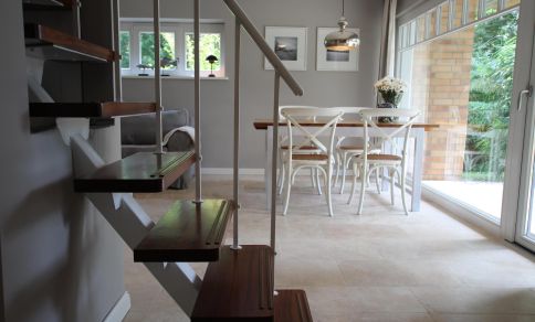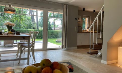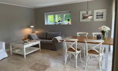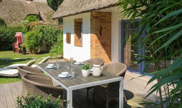 Vom Wohnbereich gelangst du auf die Holzterrasse in den liebevoll angelegten und abgeschlossenen Garten. Genieße hier Ruhe und Privatsphäre auf den Sonnenliegen oder dem hauseigenen Strandkorb. Kleine Gäste dürfen sich auf einen Sandkasten, eine Kletteranlage und eine Schaukel freuen.