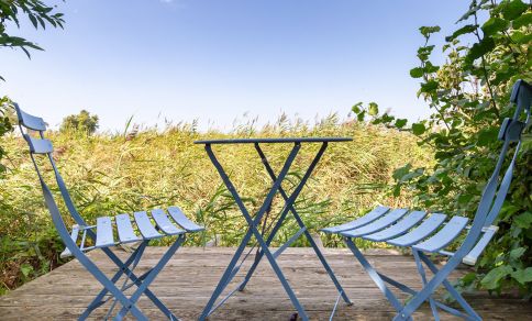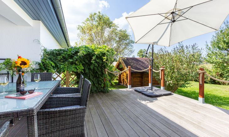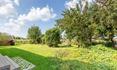 Weitere Highlights erwarten dich im Außenbereich, wie beispielsweise die großzügige Terrasse, auf der du den weiten Blick ins Grüne genießt. Das Saunahäuschen* lädt nach einem ereignisreichen Urlaubstag zum Entspannen ein und der große Garten bietet viel Platz, um einfach mal die Seele baumeln zu lassen. Eine weitere Sitzecke befindet sich an dem kleinen Kanal, der am Haus vorbeiführt - ein wunderschönes Plätzchen für den ersten Kaffee des Tages.