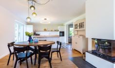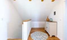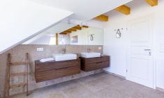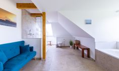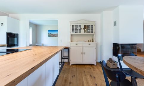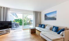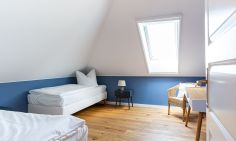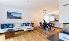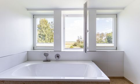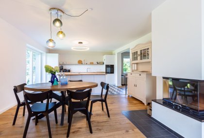 Willkommen in deinem ganz persönlichen Rückzugsort. In Eenhoorn erwartet dich hochwertiges Interieur, das Stil und Komfort perfekt miteinander verbindet. Die offene Küche ist das Herzstück des Hauses und lädt dazu ein, gemeinsam zu kochen und gesellige Stunden am großen Esstisch zu verbringen. Im Wohnzimmer befindet sich ein gemütliches Sofa, auf dem du dich am Abend vor dem knisternden Kamin entspannen kannst. Das Erdgeschoss beherbergt außerdem ein urgemütliches und liebevoll eingerichtetes Schlafzimmer sowie ein erstes Duschbad. In der oberen Etage erwarten dich zwei weitere heimelige Schlafzimmer - eins mit Doppelbett und eins mit getrennten Betten, dass sich sehr gut als Kinderzimmer nutzen lässt. Kleiderschränke, Verdunklungsmöglichkeiten und Insektenschutz an den Fenstern sorgen zudem für einen erholsamen Schlaf. Ein echtes Highlight: Das Traumbad mit einer Badewanne, von der du einen atemberaubenden Blick auf den Bodden genießt. Die große Regendusche und das stylische Sofa im Bad machen diesen Ort zu einer Wohlfühloase und runden das Luxus-Feeling perfekt ab.
