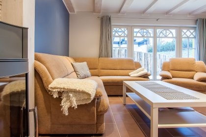 Zum Ferienhaus gehört eine Steinterrasse mit hochwertigen Möbeln, die du vom Wohnbereich betrittst. Sonnenliegen, eine zusätzliche Sitzecke im Garten und ein PKW-Stellplatz runden dieses tolle Ferienhaus ab.