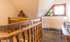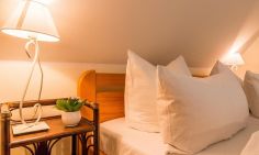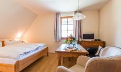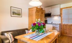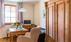 Diese kleine Appartement-Wohnung befindet sich im Obergeschoss und bietet Platz für zwei Personen. In dem kombinierten Wohn- und Schlafraum erwartet dich eine gemütliche Couch, ein Esstisch, ein Doppelbett und eine kleine Küchenzeile. Ein Bad mit Dusche/WC ist separat vorhanden. Die Wohnung ist im Landhaus-Stil eingerichtet und erstrahlt in warmem Holz. Das hochwertige Eichenparkett sorgt ebenfalls für Wohnkomfort.