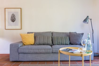 Im Außenbereich hast du eine Steinterrasse mit Gartenbestuhlung. Hier kannst du den Tag bei einem sonnigen Frühstück starten oder einfach auch nur mal die Seele baumeln lassen.