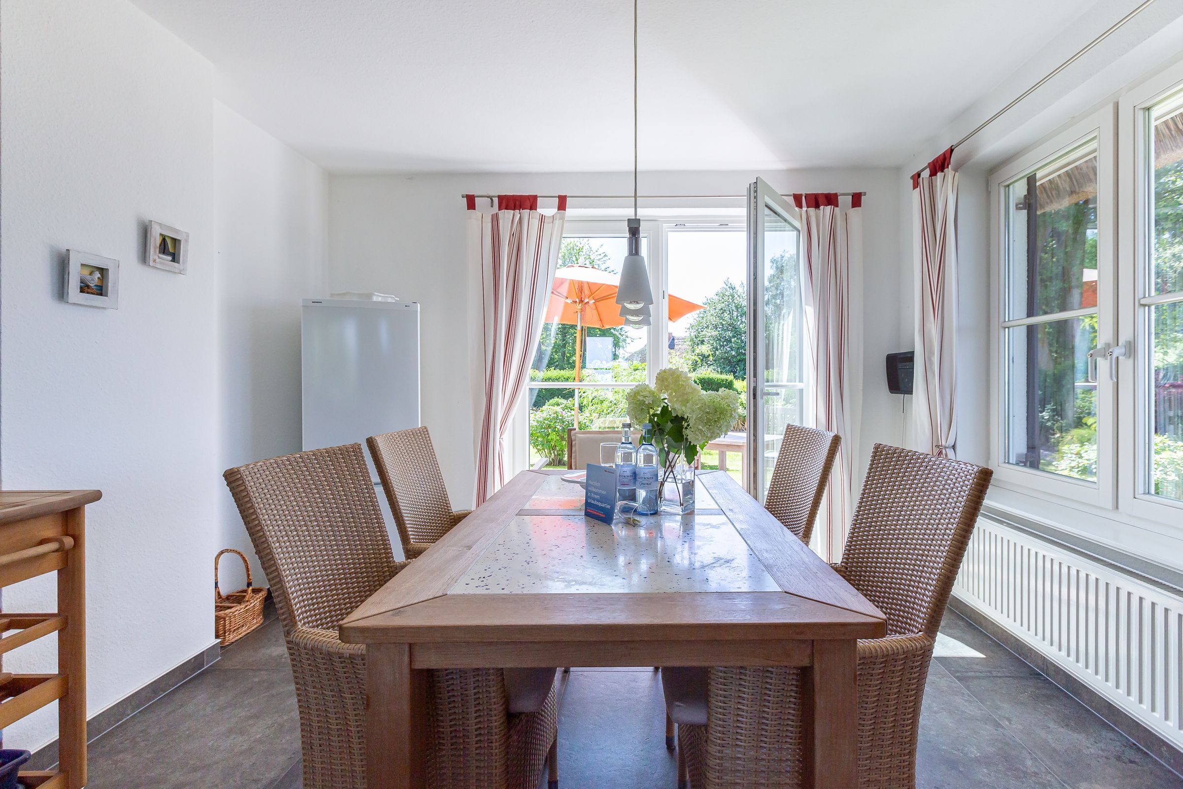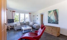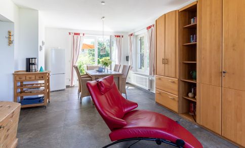 Die Unterkunft befindet sich im Erdgeschoss des Hauses und verfügt über einen lichtdurchfluteten und gemütlich eingerichteten Wohnraum, eine schlichte integrierte Küchenzeile mit 2-Platten-Ceranfeld, einen sonnigen Essbereich, ein Schlafzimmer mit Doppelbett und ein Bad mit Dusche/WC. Aus dem Schlafzimmer genießt du zudem einen wunderschönen Blick auf das Meer.