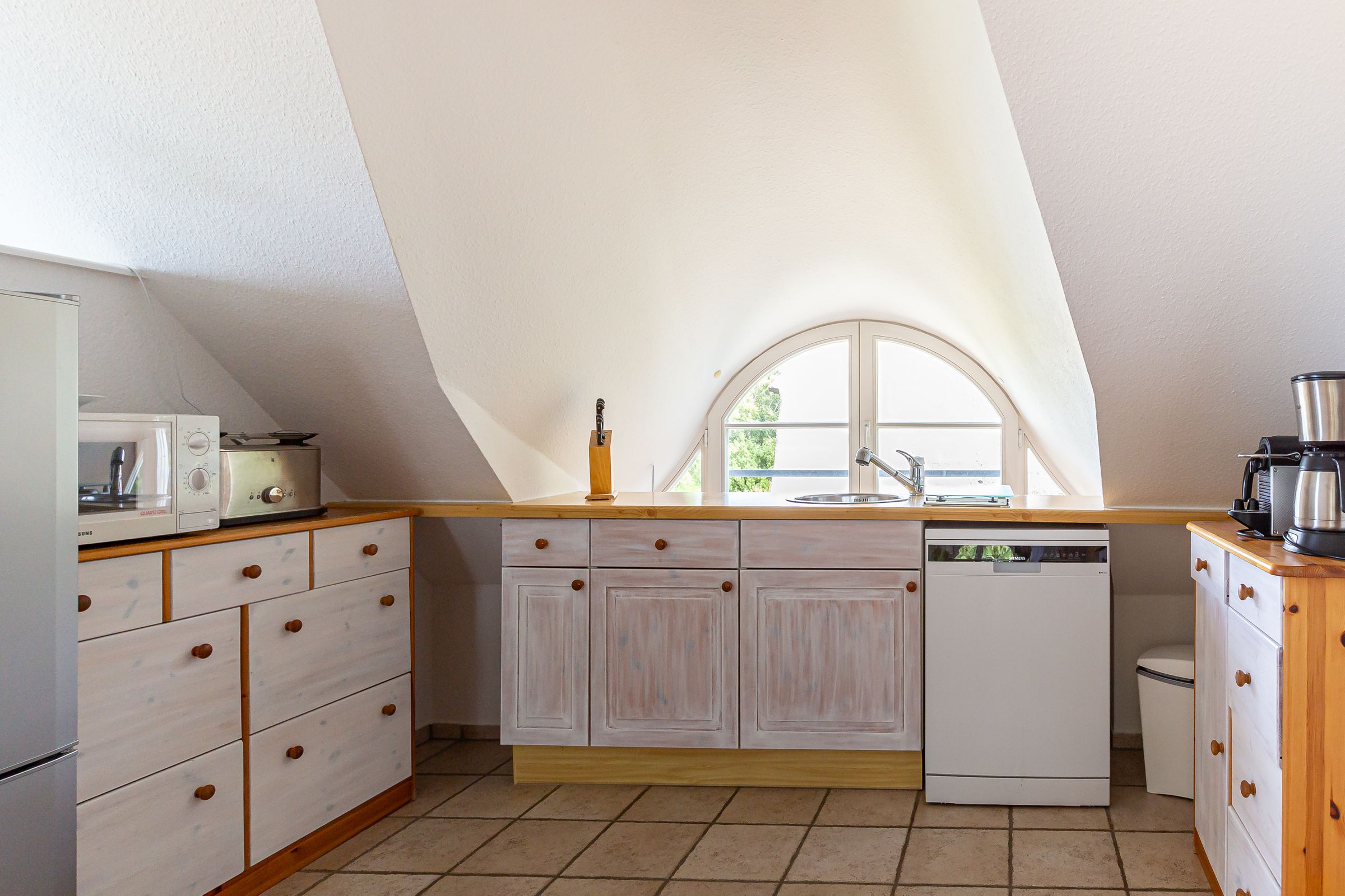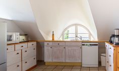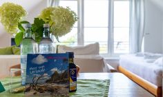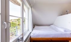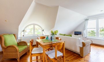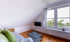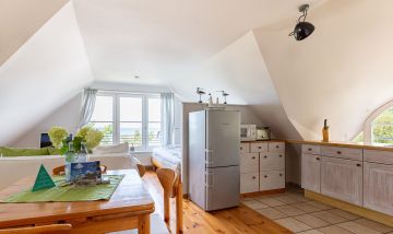 Das Ein-Raum-Appartement im Dachgeschoss verfügt über einen Wohn-und Schlafbereich mit gemütlicher Sitzecke, einem Doppelbett (180 cm) und einer kleine Küchenzeile mit Esstisch. Das Tageslichtbad mit Dusche/WC und Handtuchtrockner befindet sich separat. Du genießt aus der Wohnung einen traumhaften Meerblick.