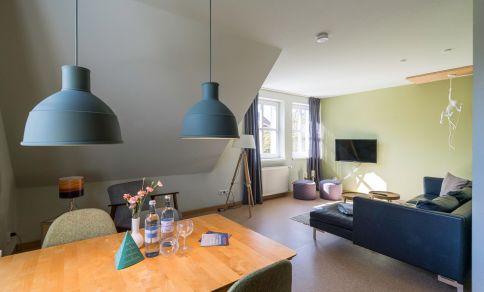 Die moderne Maisonettewohnung überzeugt mit puristischem skandinavischem Charme und einem harmonischen, farbenfrohen Design. Im ersten Stock befinden sich ein gemütliches Schlafzimmer, ein einladendes Wohnzimmer, eine offene Küchenzeile und ein Tageslichtbad. Über eine Treppe führt der Weg ins Dachgeschoss, wo ein weiteres Schlafzimmer mit Boxspringbett mit Zugang zur großzügigen Dachterrasse liegt – ein idealer Ort, um frische Luft und Entspannung zu genießen.