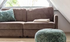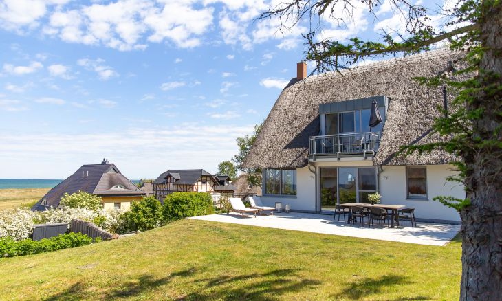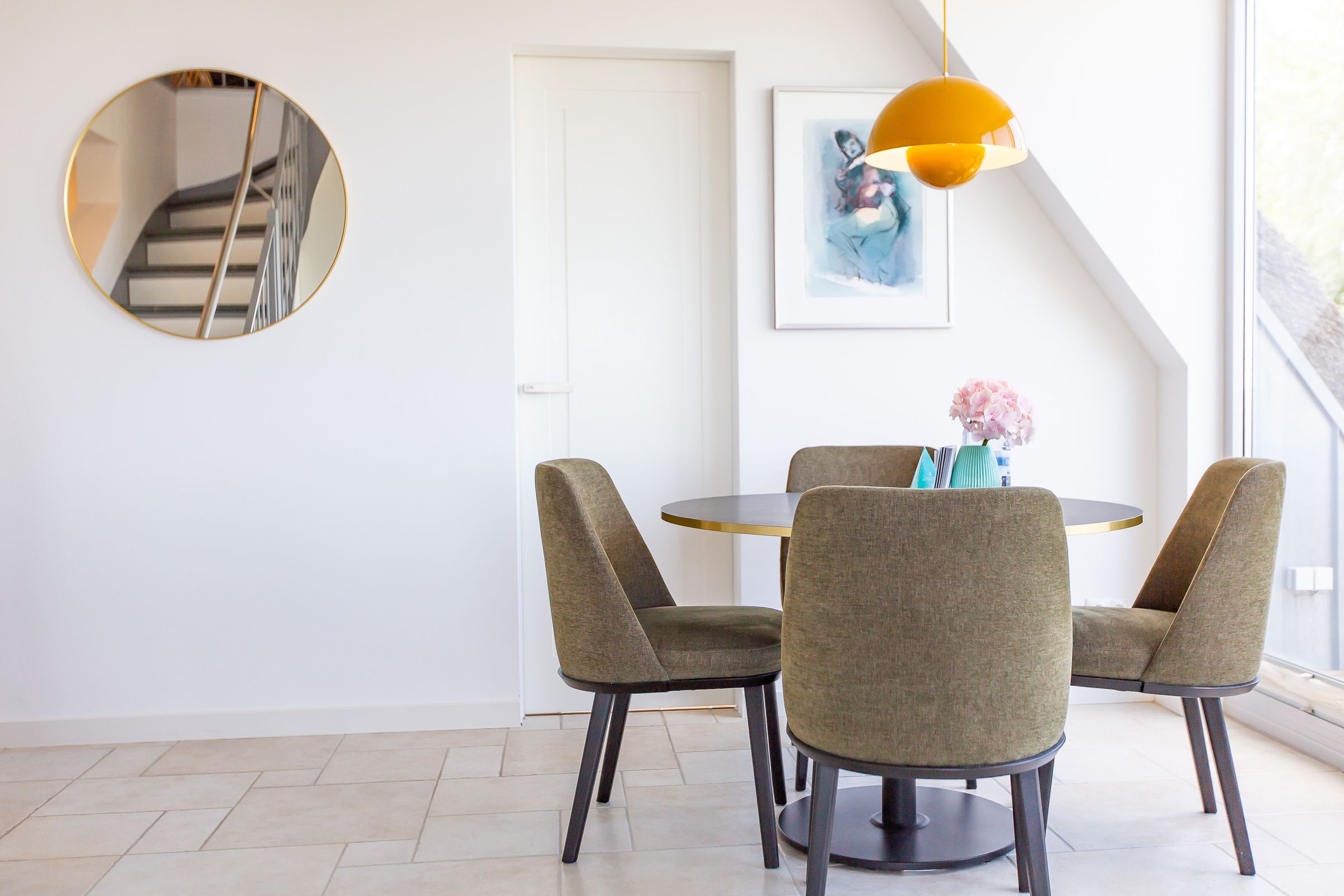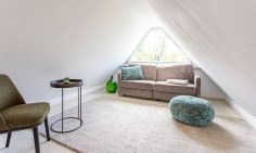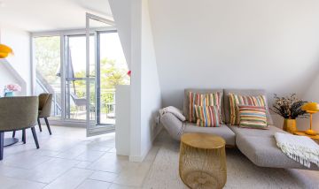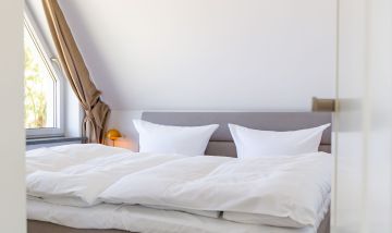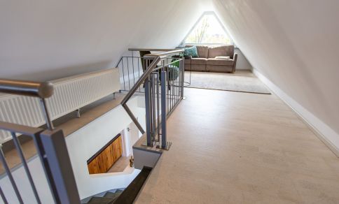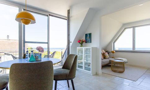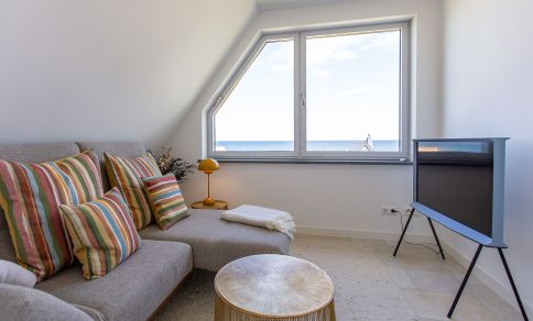 Über eine zusätzliche Treppe gelangst du in das Dachgeschoss. Mit dem Schlafsofa, den Sitzkissen und dem Tagesbett wurde hier ein weiterer Ort der Ruhe und des Rückzugs geschaffen. Der Raum lädt nicht nur als zweites Schlafzimmer ein, sondern auch sich zurückzulehnen, ein gutes Buch zu lesen oder die Lieblingsmusik beim Beobachten des Sonnenuntergangs zu genießen. Denn der Höhepunkt und somit zweifelslos ein atemberaubendes Urlaubserlebnis ist der spektakuläre Ausblick auf das Meer - aus (fast) jedem Raum!