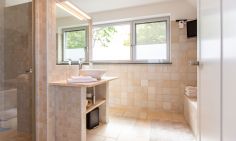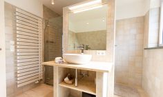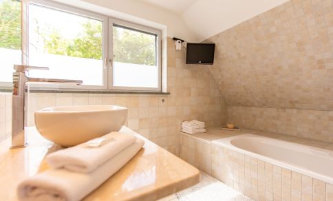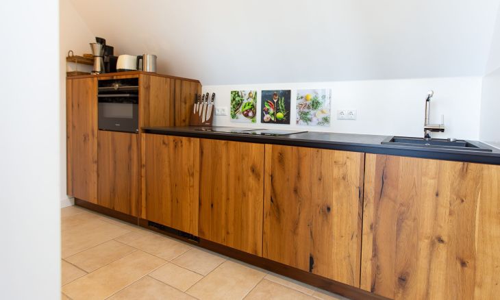 Das neu und aufwendig sanierte Haus Anna bietet den perfekten Rahmen für einen unvergesslichen Urlaub. Über eine Treppe gelangst du in den ersten Stock und somit in den Eingang der Wohnung. Das Herzstück ist zweifelsohne der offen gestaltete Wohn-, Ess- und Küchenbereich, in dem Stil und Gemütlichkeit aufeinandertreffen. In der voll ausgestatteten Küchenzeile befinden sich modernste Geräte, die das Kochen zum Vergnügen machen. Apropos Vergnügen: Das macht auch das Esszimmer mit den eleganten Möbeln und dem spektakulären Ausblick. Für den gemütlichen Teil des Tages befindet sich im Wohnzimmer ein großzügiges Sofa und ein Smart-TV. Erholsame Nachtruhe verspricht das komfortable Boxspringbett. Hier kannst du dich nach Herzenslust einkuscheln und den Alltagsstress hinter dir lassen. Abgerundet wird die Etage durch ein elegantes Badezimmer, dass zum einen über eine großzügige Regendusche und zum anderen über eine Badewanne mit TV verfügt.
