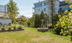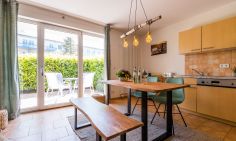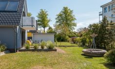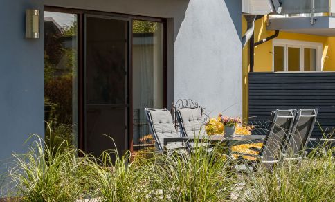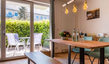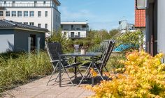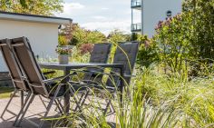 Eine kleine Terrasse gehört ebenfalls zur Ferienunterkunft und kann vom Wohnbereich betreten werden. Hier kannst du deinen Urlaubstag bei einem sonnigen Frühstück starten oder am Abend ausklingen lassen. Auf dem 650 Quadratmeter großen Grundstück mit kleiner Rasenfläche befindet sich eine Sitzbank. In dem Nebengebäude steht ein Grill für alle Feriengäste des Hauses zur Verfügung. Ein Pkw-Stellplatz je Wohnung steht zur Verfügung.