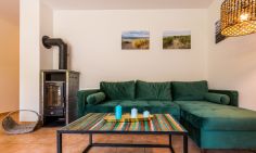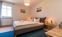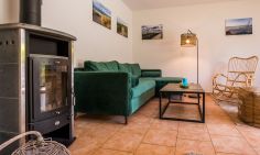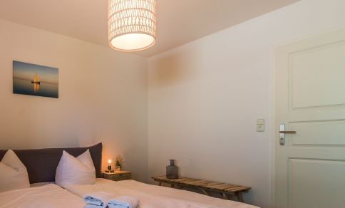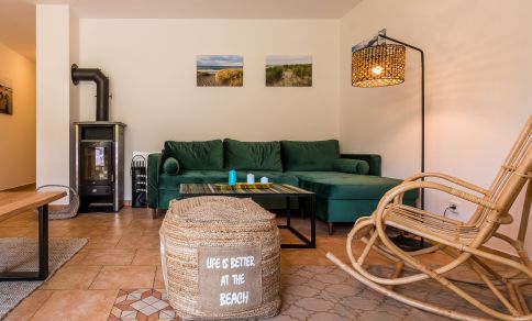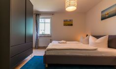 In der Erdgeschosswohnung erwartet dich ein großzügiger Wohn- und Küchenbereich. Dank der gemütlichen Sofalandschaft kannst du hier herrlich klönen, während es aus dem Kaminofen knistert. Das Sofa kann als Aufbettung für ein bis zwei Personen genutzt werden. Die Küchenzeile und der Esstisch an bodentiefen Fenstern sind ebenfalls im Wohnraum integriert. Das separate Schlafzimmer ist mit einem Doppelbett ausgestattet und verspricht entspannte Nächte für einen erholsamen Urlaub. Abgerundet wird die Ferienwohnung mit dem Tageslichtbad, ausgestattet mit Dusche und WC.