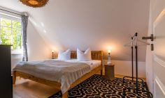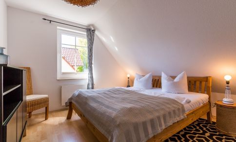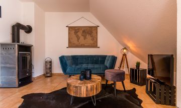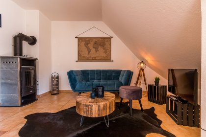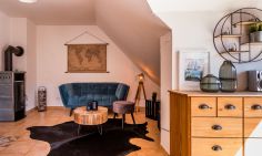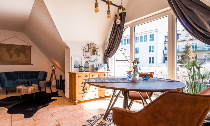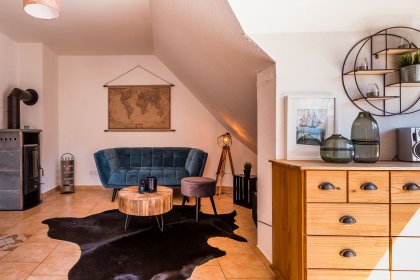 Die niedliche und modern eingerichtete Ferienwohnung befindet sich im ersten Obergeschoss von Haus Ostseenixe. Der offene Wohn- und Küchenbereich begeistert mit einer gemütlichen Couch am Kaminofen. Materialien wie Samt, Holz, Metall und ein Kuhfell sind nicht nur geschmackvoll und trendy, sondern sorgen auch für eine sehr gemütliche Wohnatmosphäre. Die Küchenzeile und der Esstisch an bodentiefen Fenstern sind ebenfalls im Wohnraum integriert. Das separate Schlafzimmer ist mit einem Doppelbett ausgestattet und verspricht entspannte Nächte für einen erholsamen Urlaub. Abgerundet wird die Ferienwohnung mit einem Tageslichtbad inklusive Dusche/WC.