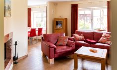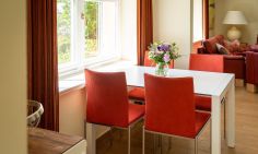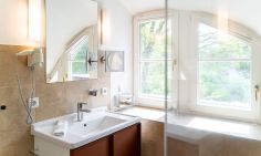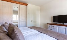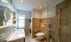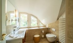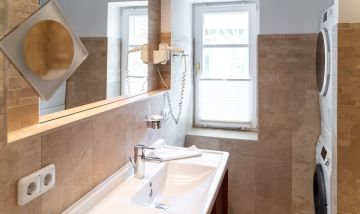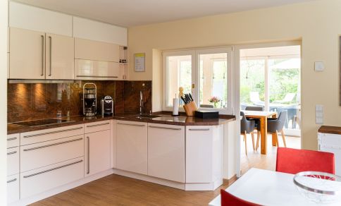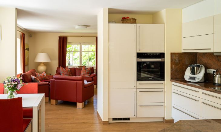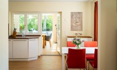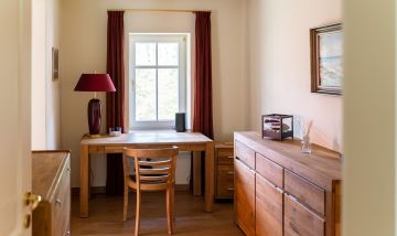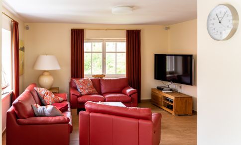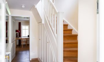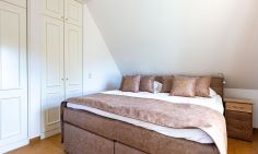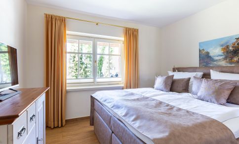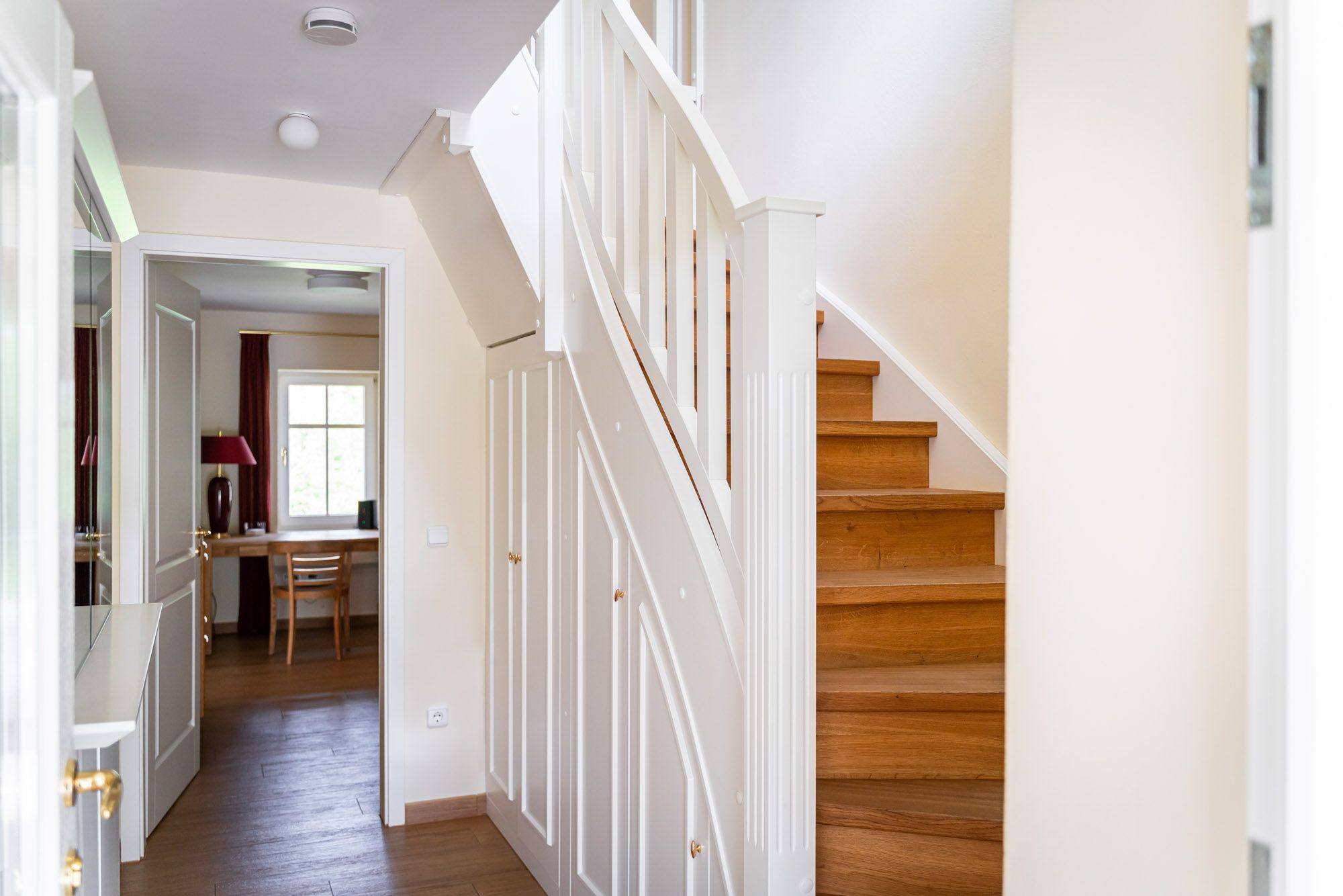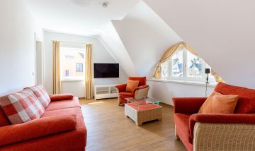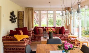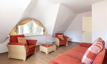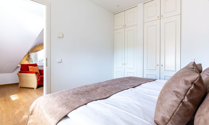 Die Fünf-Sterne-Maisonette-Wohnung erstreckt sich über zwei Etagen und ist über einen separaten Eingang auf der Rückseite des Hauses erreichbar. Du betrittst die Wohnung direkt über den lichtdurchfluteten Wintergarten. Hier empfängt dich der lichtdurchflutete Essbereich und eine gemütliche Sitzecke mit einem fantastischen Blick in den idyllischen Garten. Von hier gelangst du in die moderne Küche und in den großzügigen Wohnraum mit einer gemütlichen Couchgarnitur am Kamin. Das Arbeitszimmer schließt sich direkt an, ebenso ein Schlafzimmer mit einem Doppelbett und das Wellness-Bad mit Dusche/WC. Die separate Sauna sorgt nach einem erlebnisreichen Tag für traumhafte Entspannung. Das Dachgeschoss verfügt über ein zweites Schlafzimmer mit einem Doppelbett sowie einem zusätzlichen Zimmer mit einem Sofa, dass als Aufbettung für eine weitere Person genutzt werden kann. Ein zweites Bad mit Dusche/WC als auch die Fußbodenheizung in der gesamten Ferienwohnung sorgen für zusätzlichen Wohnkomfort. Die Ferienwohnung verfügt zudem über Highspeed-Internet und eignet sich daher hervorragend für eine Workation.